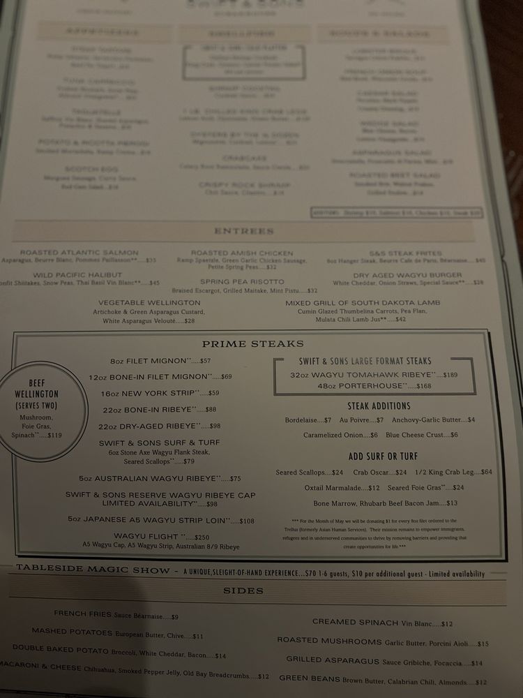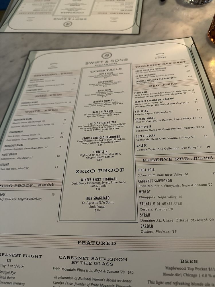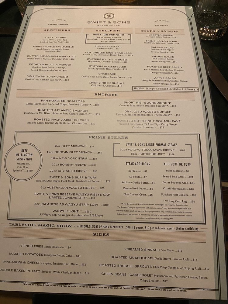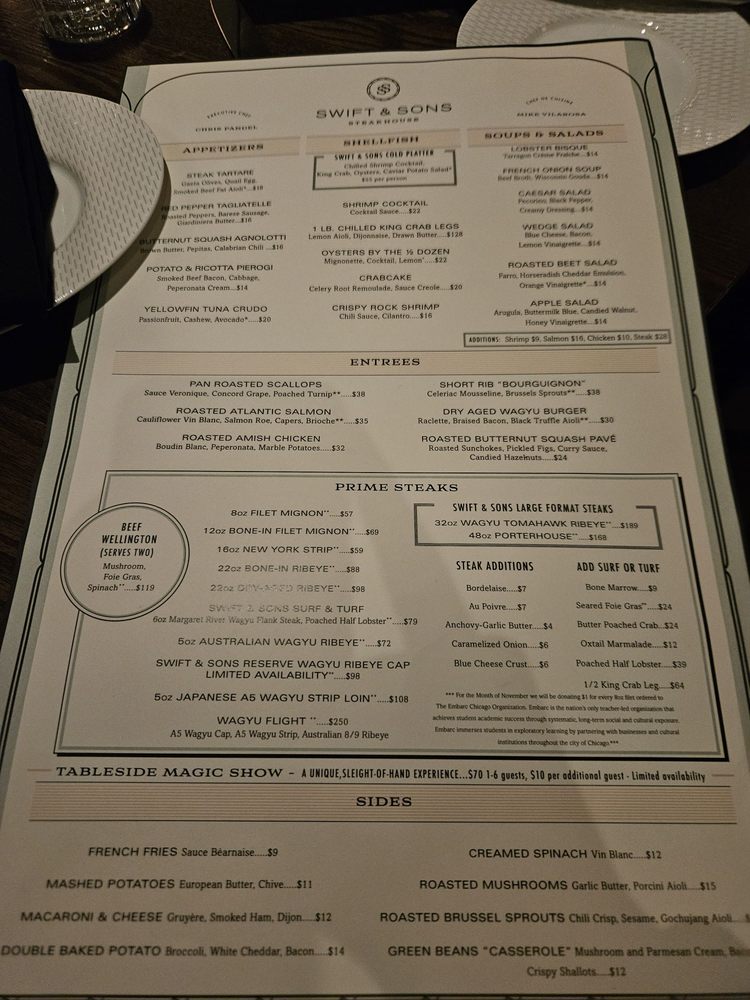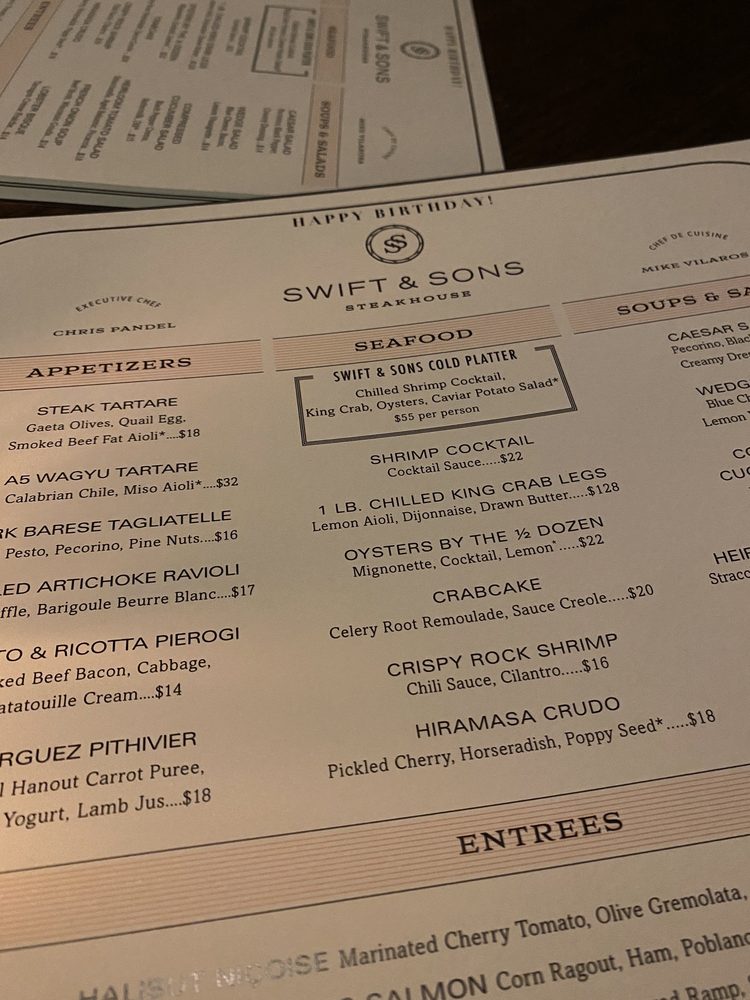 Introducing Swift & Sons, a trendy, upscale steakhouse in Chicago's West Fulton Market. Known for its extensive menu, Swift & Sons offers a variety of options, including vegetarian, pescatarian, and keto choices. The ambiance is classy, perfect for a dinner gathering with friends or a special occasion. The customer reviews rave about the quality of the food, particularly the steaks and seafood options. Highlights include the Wagyu Sausage En Croute, Black Olive Crusted Halibut, and the Dry Aged Wagyu Burger. The attentive staff, delicious cocktails, and comfortable seating add to the overall dining experience. With elegant decor and exquisite dishes, Swift & Sons promises a memorable dining experience for any food enthusiast.